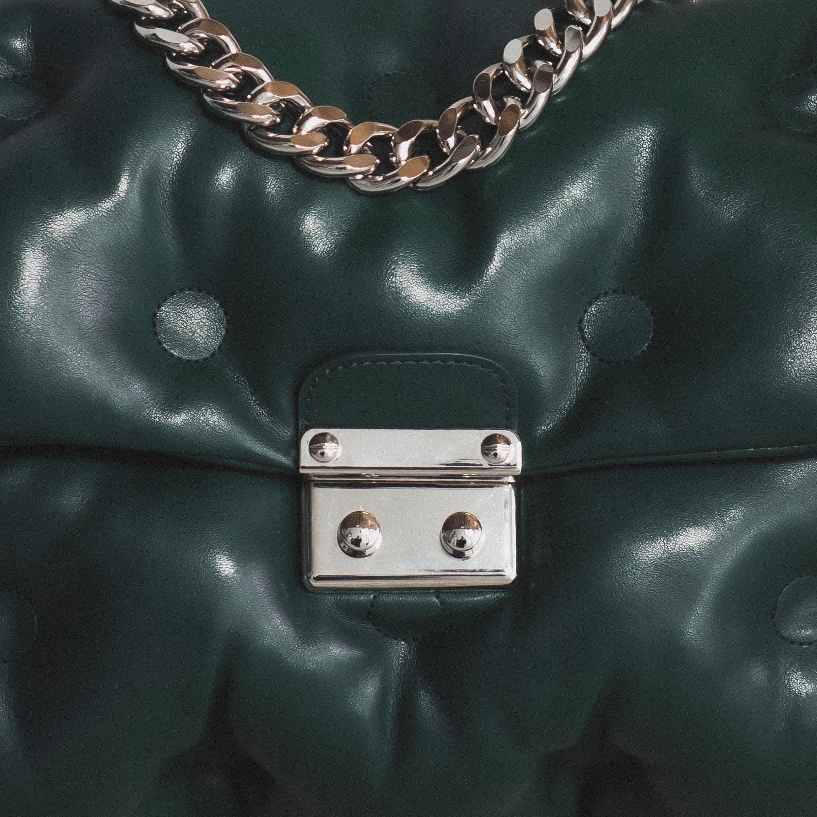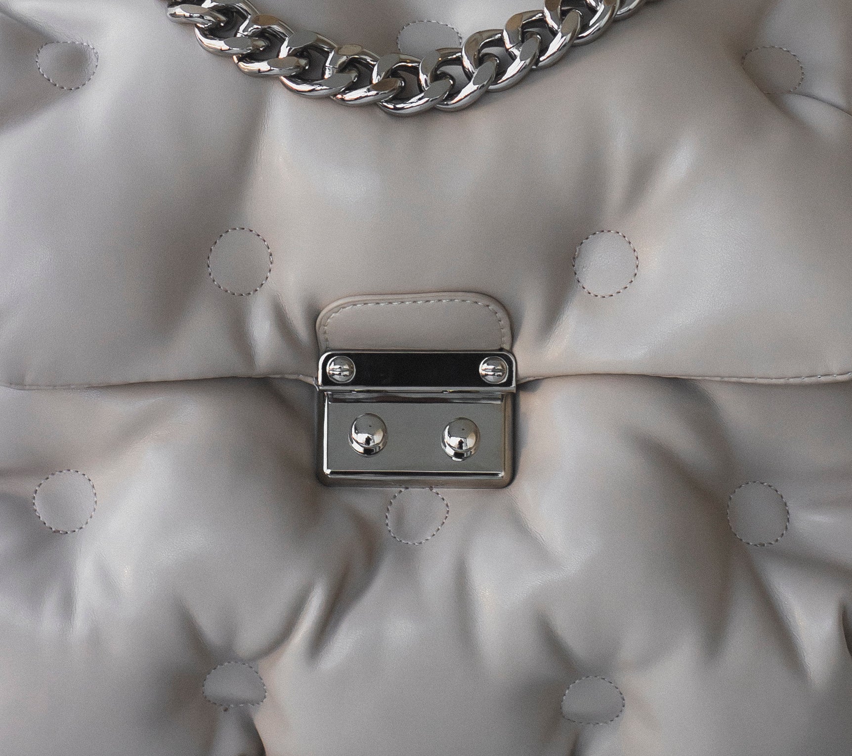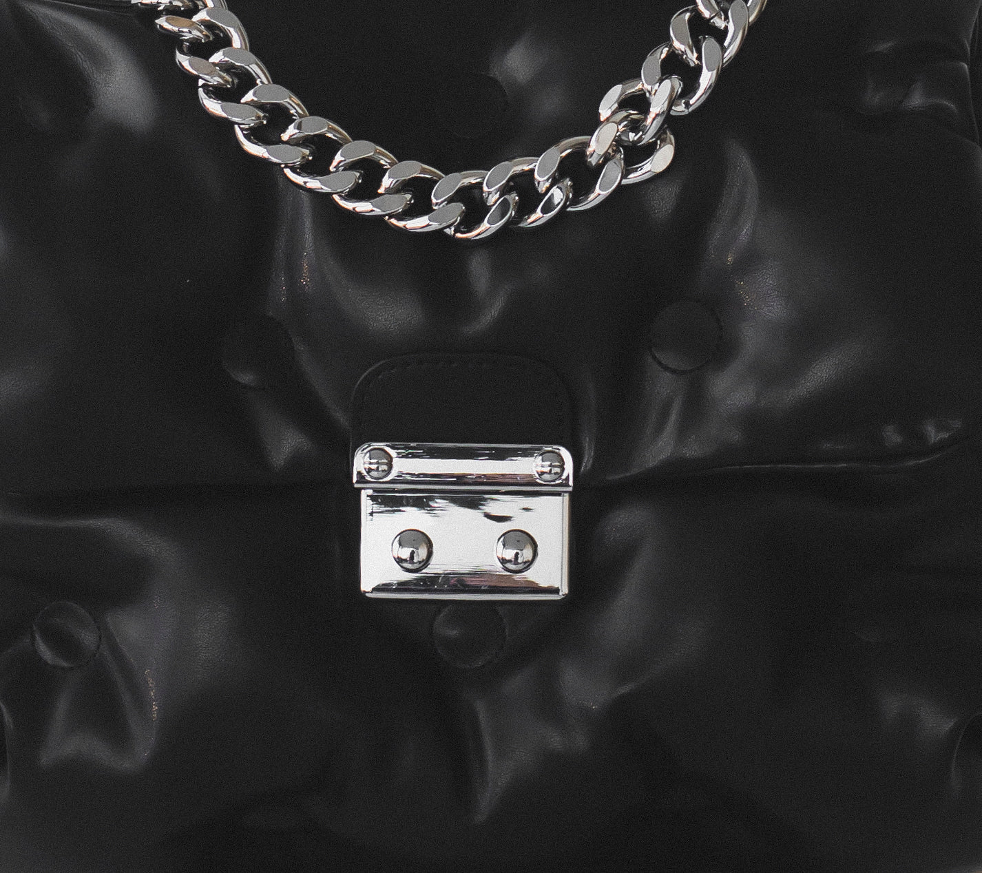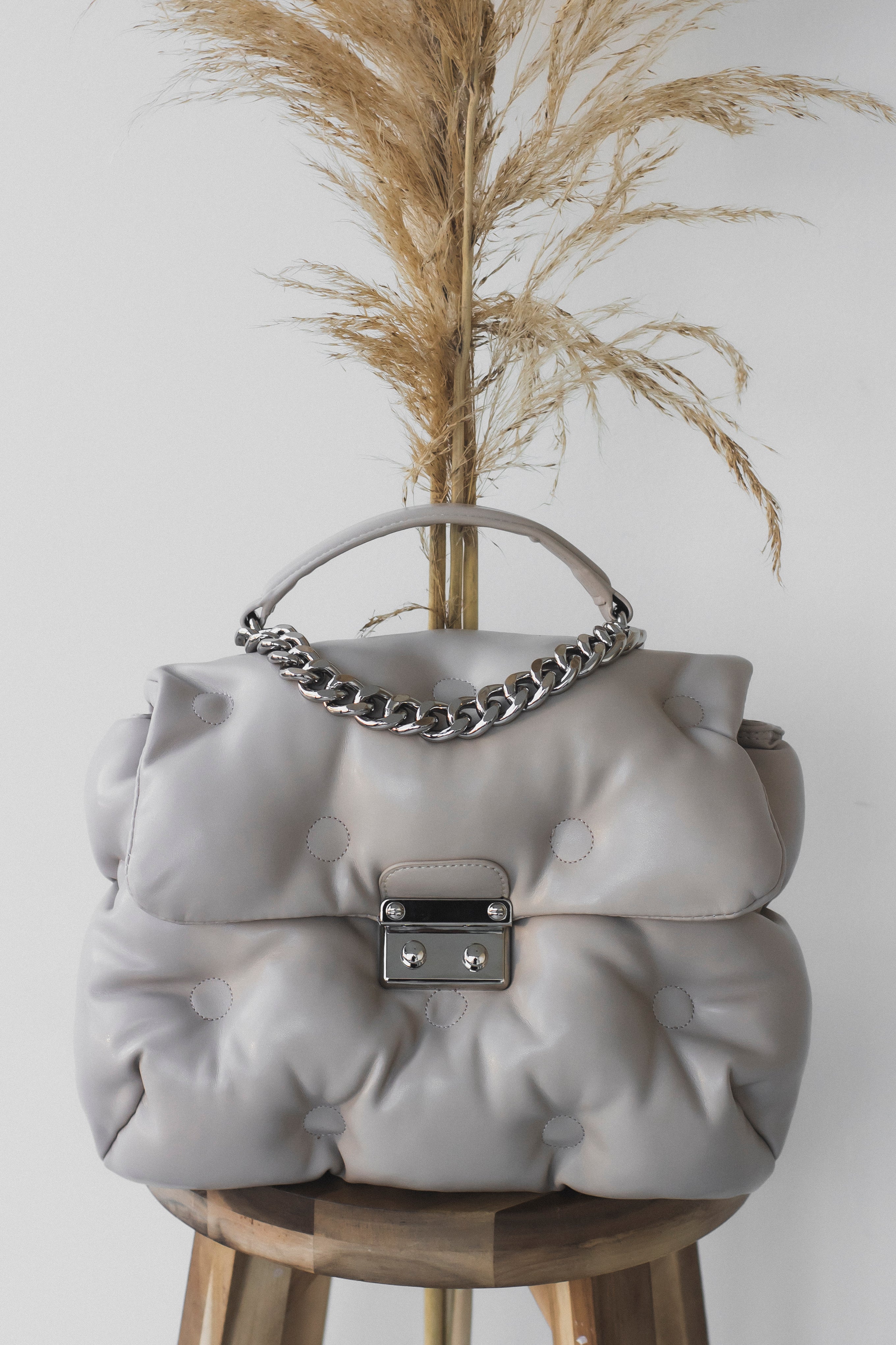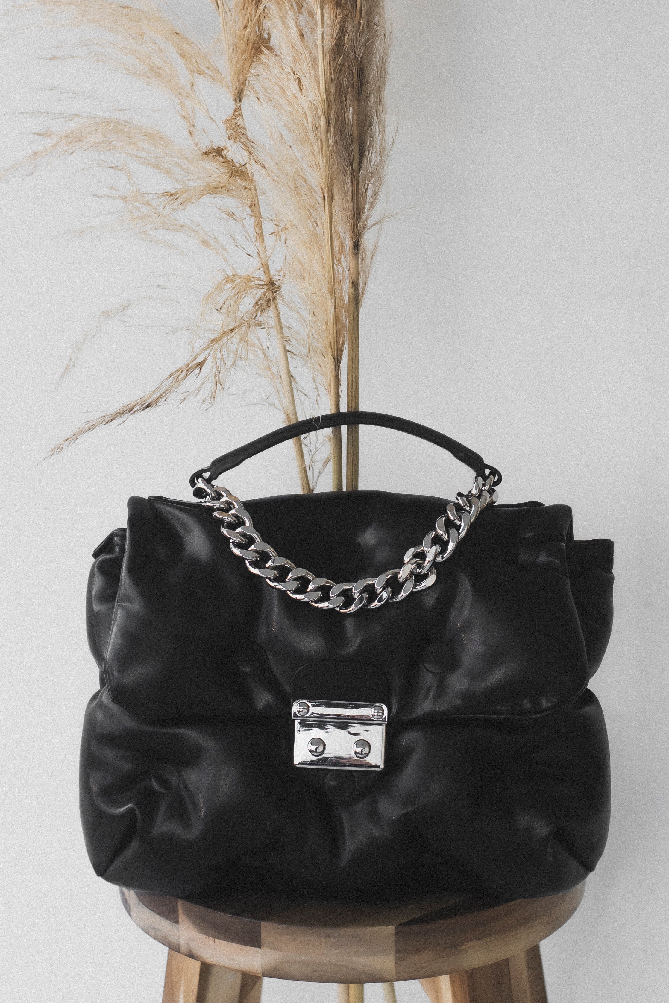 Upgrade your closet to make a bold statement with the iconic Pillow Purse. Crafted with soft vegan leather cushioned in the front and back with a decorative silver Cuban chain. Opens with a silver pinch clasp and an inner zipper. The inside is lined with two small compartments, perfect for cards or a phone, and a larger compartment with a zipper. Comes with a detachable long leather strap to carry over the shoulder or across the body.